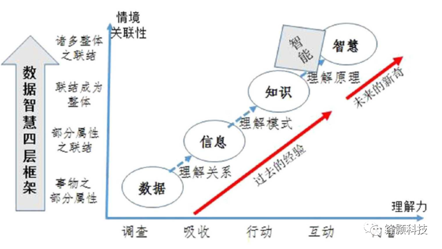 中科院顾基发院士受到钱学森先生“大成智慧”论的影响,近年来一直致力于研究网络对人类智慧发展的作用。他在2015年发表的—篇文章《协同创新-综合集成-大成智慧》中提到了在20世纪80年代末由Zeleny和Ackoff先后提出的DIKW(数据-信息-知识-智慧)说法,这涉及到Ackoff使用的一幅图。